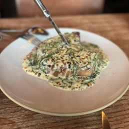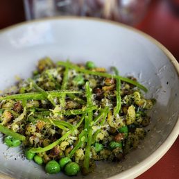 My husband and I had a delightful time at Rustic Canyon. We ordered the trout, duck, pork chop, and sourdough spaghetti. The pork chop was a bit salty for my taste buds , but my husband found it yummy. The trout, with the roe and dill, was quite delicious. For dessert, the peach cake and honeycomb ice cream truly stole the show, while the coconut rice pudding, though slightly overpowered by blueberries, was still enjoyable. Overall, we were impressed and would definitely return.